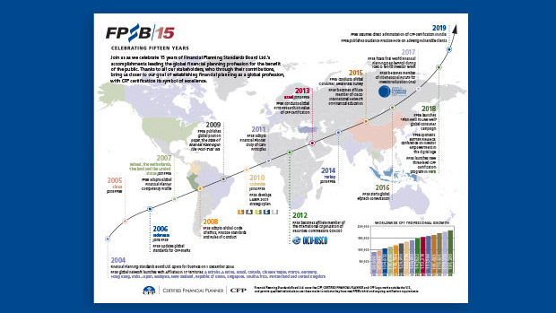 Trade show display, 15-year timeline artwork, and digital magazine covers for a company that educates and supports financial planning organizations worldwide