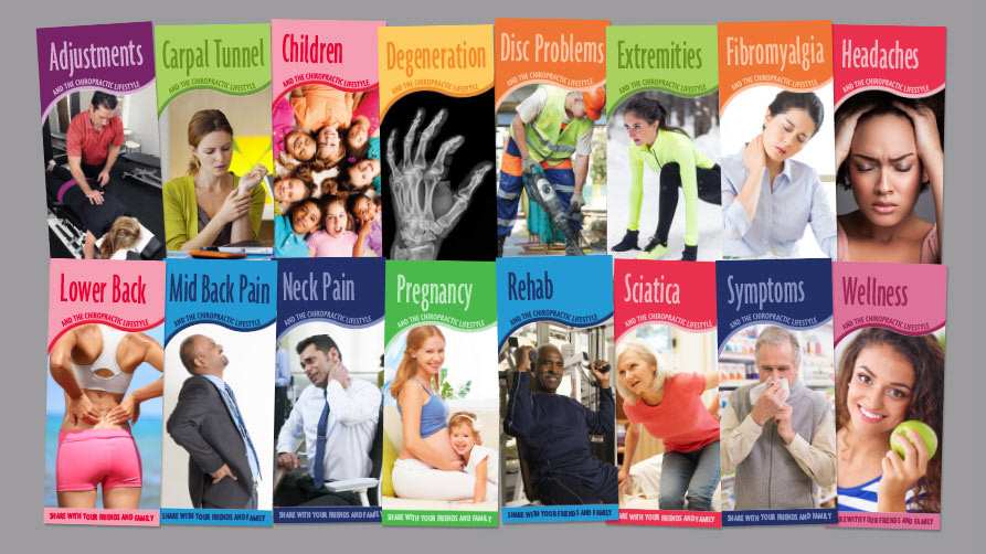28 different brochures and an eight-page magazette for a chiropractic patient education and marketing products company that ships worldwide
